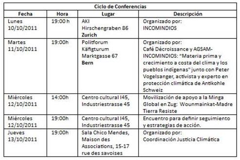 La Minga en Zug-Suiza: Wounmainkat – Madre Tierra Resiste, cuenta con el amplio respaldo de los parlamentarios cantonales Stephan Gisler y Anna Lustemberger del Partido Verde de Zug (Alternative – die Grünen Zug), quienes cuestionan ampliamente las operaciones de las compañías suizas en países del Sur, así mismo cerca de 10 organizaciones suizas se han adherido a esta importante iniciativa que se llevará a cabo el 12 de octubre de 2011 “Día de la Resistencia Indígena”, en el Cantón de Zug, lugar en donde se encuentran las oficinas financieras de Xstrata y Glencore.