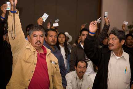 Pie de foto: Una asamblea el pasado otoño en Oaxaca de Organizaciones Indígenas Binacional, llamando a una política de desarrollo sustentable que pueda sostener a los agricultores. Por David Bacon.