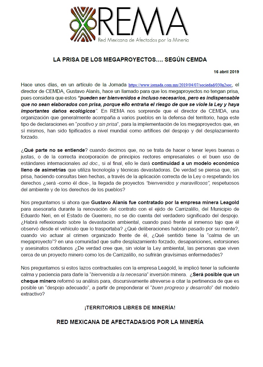 COMUNICADO REMA. «LA PRISA DE LOS MEGAPROYECTOS… SEGÚN CEMDA»
