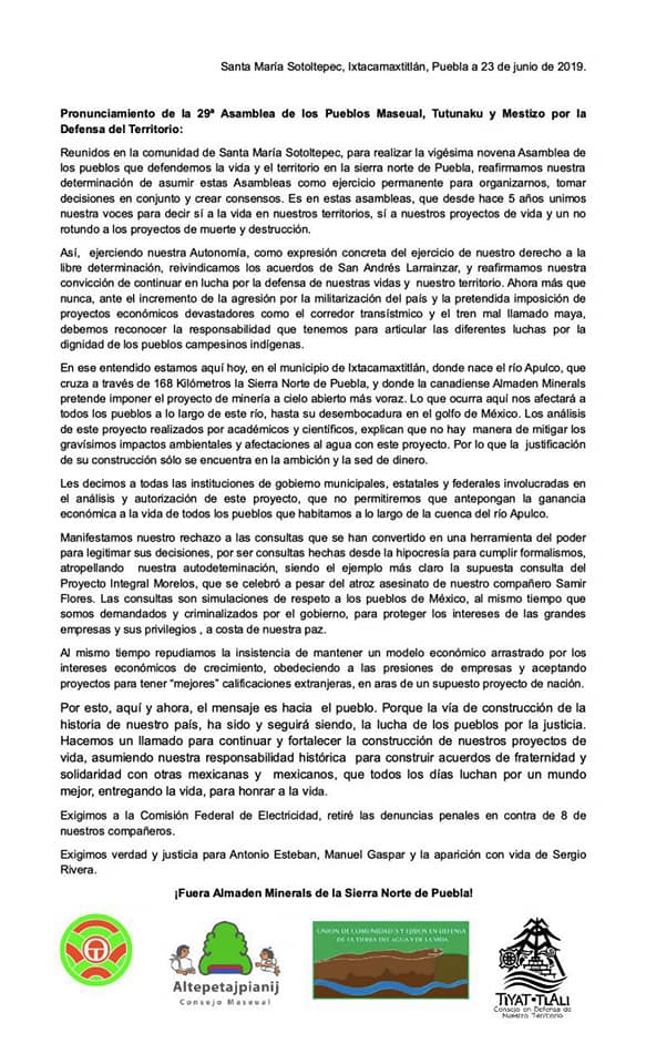 PRONUNCIAMIENTO DE LA 29 ASAMBLEA DE LOS PUEBLOS MASEUAL, TUTUNAKU Y MESTIZO POR LA DEFENSA DEL TERRITORIO por remamx | Jun 24, 2019 | Declaraciones/boletines, Puebla | 0 Comentarios Enviar comentario Cancelar la respuestaTu dirección de correo electrónico no será publicada. Los campos obligatorios están marcados con *Comentario * Nombre * Correo electrónico * Web Guarda mi nombre, correo electrónico y web en este navegador para la próxima vez que comente.