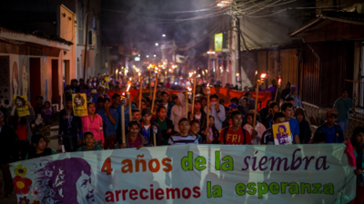 Distintas organizaciones acompañan al Consejo Nacional de Organizaciones Populares e Indígenas de Honduras (COPINH), organización que dirigía Berta Cáceres al ser asesinada. En una marcha de antorchas exigieron justicia por el asesinato de la ambientalista, La Esperanza, 2 de marzo de 2020. Crédito: Martín Cálix/ Contracorriente