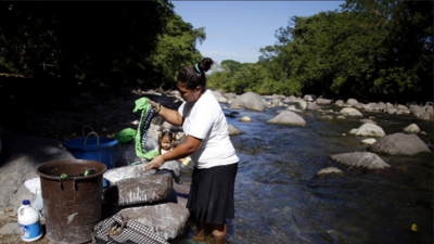 Carmen lava el uniforme del equipo de fútbol femenino de la comunidad de Guapinol mientras la menor de sus hijas juega a un lado de ella, dentro del río. Esta mujer estuvo en la resistencia al proyecto minero y su esposo migró hacia Estados Unidos cuando estalló el conflicto. Crédito: Martín Cálix/ Contracorriente.