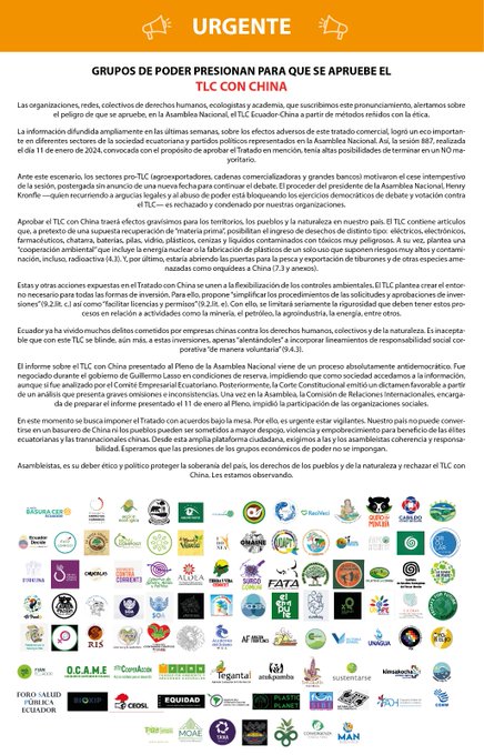 89 ORGANIZACIONES DE LA SOCIEDAD CIVIL SE OPONEN AL TLC CON CHINA Organizaciones alertan que grupos de poder pro- TLC están generando presiones y negociando la aprobación de este acuerdo comercial en la @AsambleaEcuado