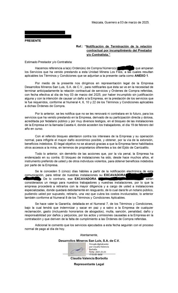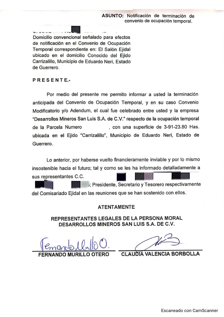 El pasado 3 y 5 de marzo el corporativo minero empezó el envío de notificaciones a distintos habitantes de nuestra comunidad para finiquitar contratos de prestación de servicios que localmente conocemos como concesionarios, así como en un burdo acto usando un engaño de revisión de cláusulas del convenio social vigente al 31 de marzo, con notario en mano y sin prácticamente platicar con nuestros representantes agrarios que los esperaban para la revisión que ellos solicitaron, pegaron el aviso de dar por terminada la relación de ocupación de tierras y que se dieran por notificados los parcelarios de nuestra comunidad.