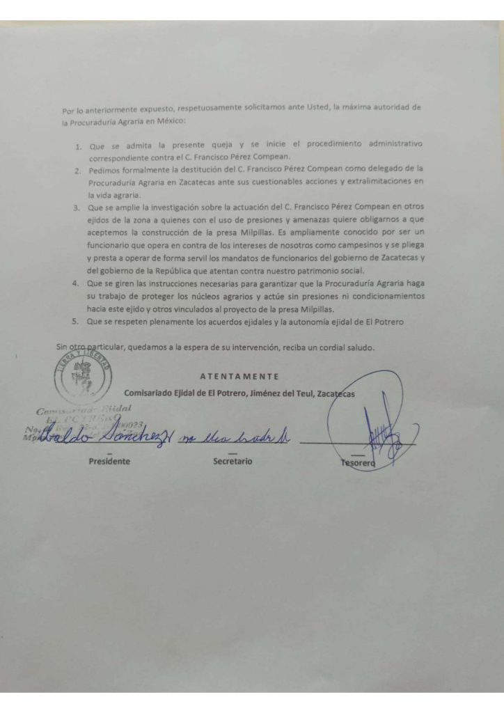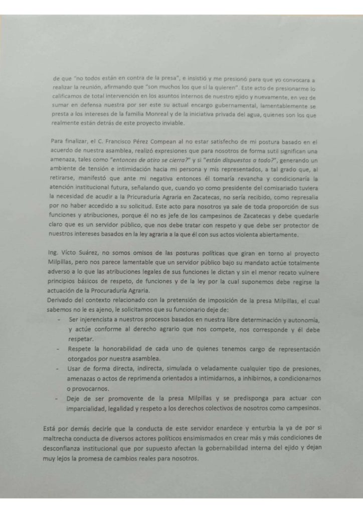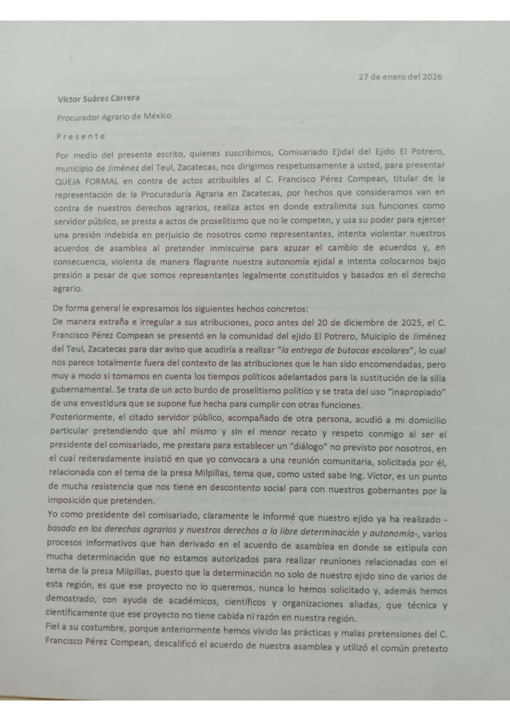Desde el Movimiento en Defensa del Territorio y el Río Atenco hacemos público que el martes 27 del presente entregamos a Víctor Suárez Carrera, titular de la Procuraduría Agraria (PA), una queja contra Francisco Pérez Compeán, responsable de la oficina de la PA en Zacatecas, por la injerencia que ha ejercido en diversos ejidos y, de manera particular, en el ejido El Potrero, municipio de Jiménez del Teul, donde se pretende construir el embalse de la Presa Milpillas.